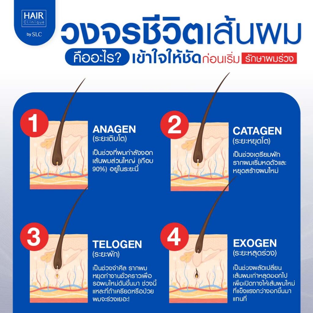 - Exogen (ระยะหลุดร่วง) เป็นช่วงผลัดเปลี่ยน เส้นผมเก่าหลุดออกไป เพื่อเปิดทางให้เส้นผมใหม่ที่แข็งแรงกว่างอกขึ้นมาแทนที่