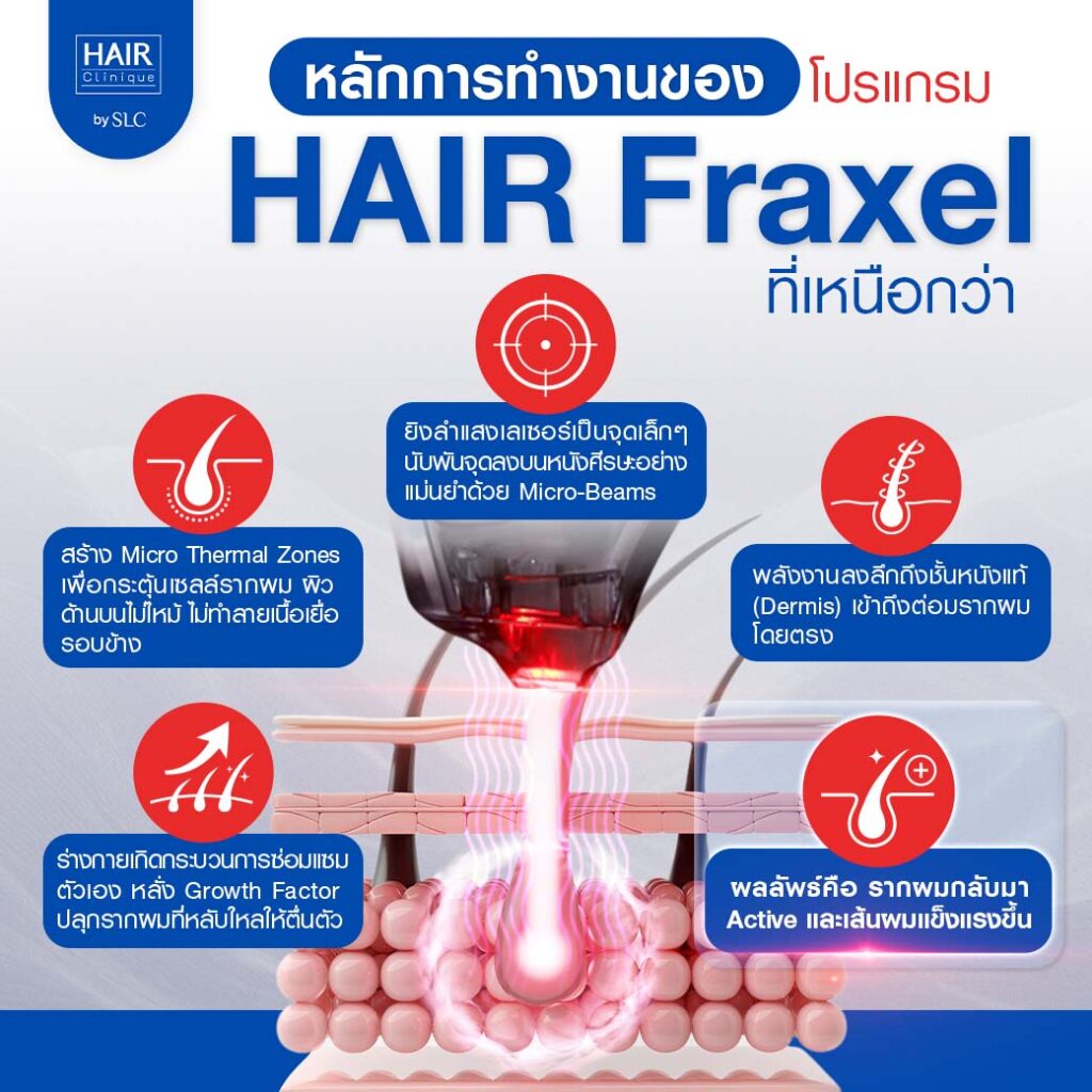 โปรแกรม Hair Fraxel จะยิงลำแสงเลเซอร์ที่มีอนุภาคขนาดเล็กมาก (Micro-beams) ลงไปเป็นจุดเล็กๆ นับพันจุดบนหนังศีรษะ แทนการยิงแสงลงไปกว้างๆ ทั่วศีรษะ พลังงานนี้จะลงลึกถึงชั้นหนังแท้ (Dermis) ซึ่งเป็นที่อยู่ของต่อมรากผม